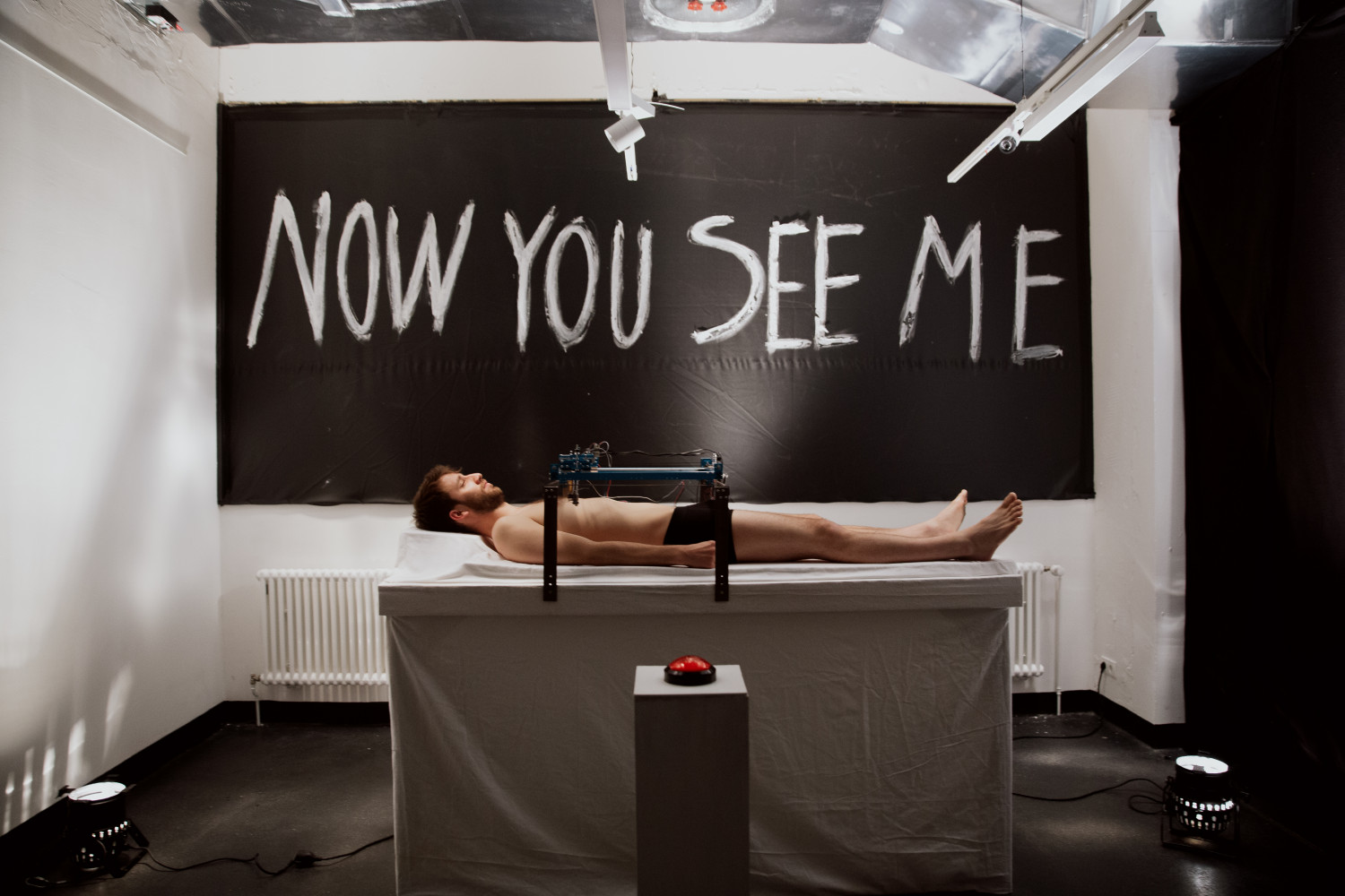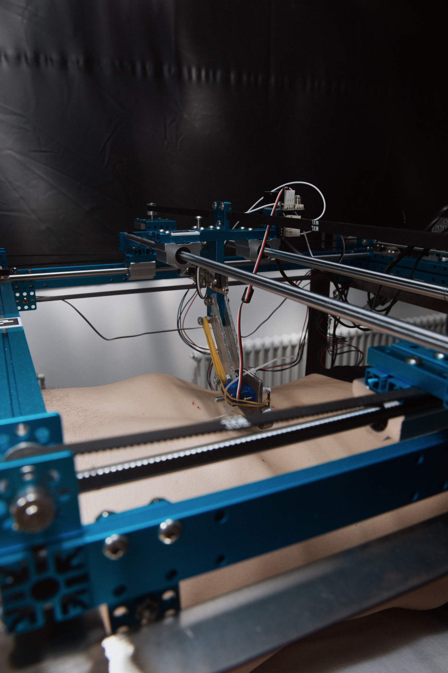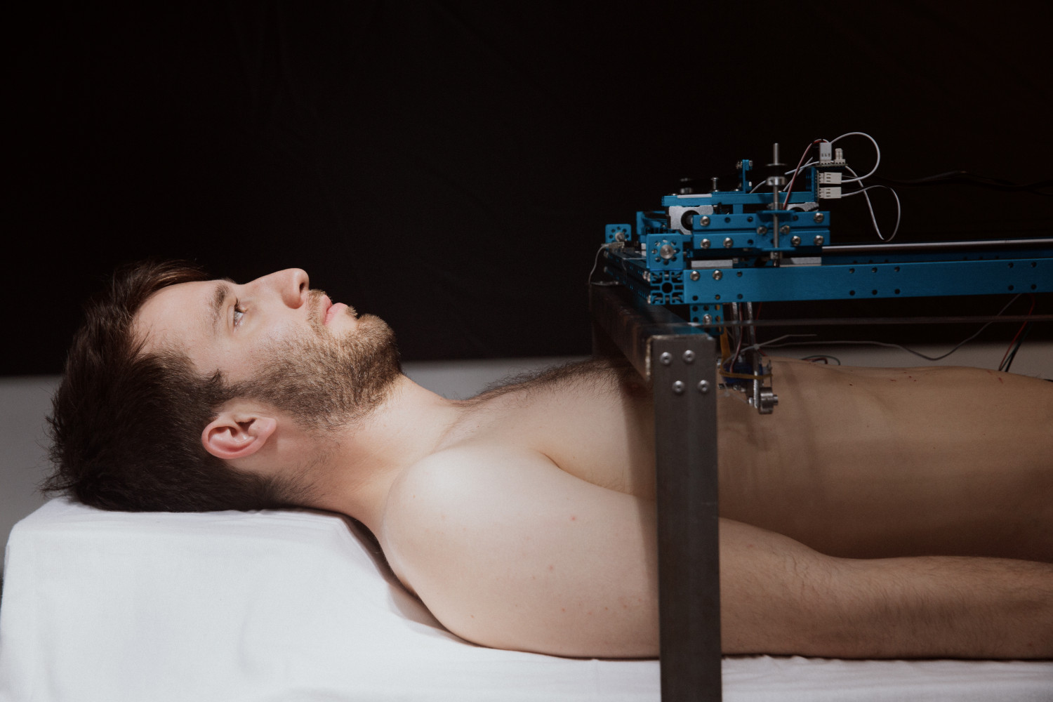 In einem dunklen Raum lag ich auf einen Tisch gebettet und unter einem Roboter fixiert. Der Roboter war mit einem Servomotor ausgestattet, der ein kleines Skalpell auf und ab bewegte. Geführt von Code wurde das Skalpell zu hundert Koordinaten auf meinem Bauch bewegt, die schließlich ein €-Zeichen bildeten. Jedes Mal, wenn das Publikum den Raum betrat, konnte es entscheiden, ob es die Aufführung sehen wollte. Wenn ja, konnten es einen rot leuchtenden Knopf drücken, der sich in der Mitte des Raumes befand.