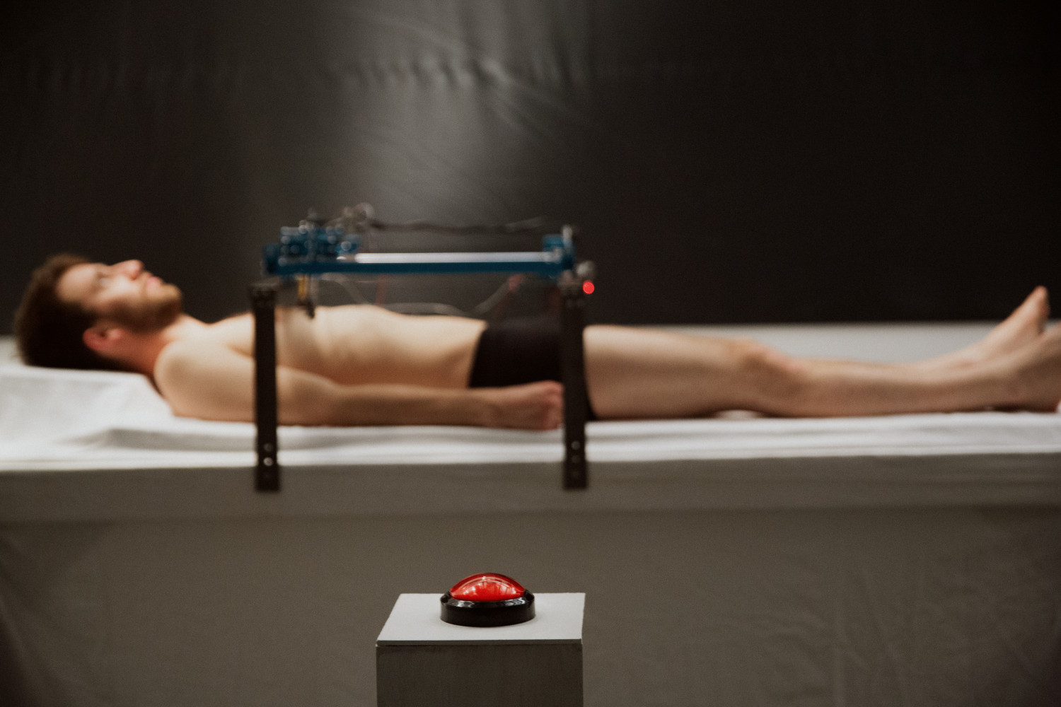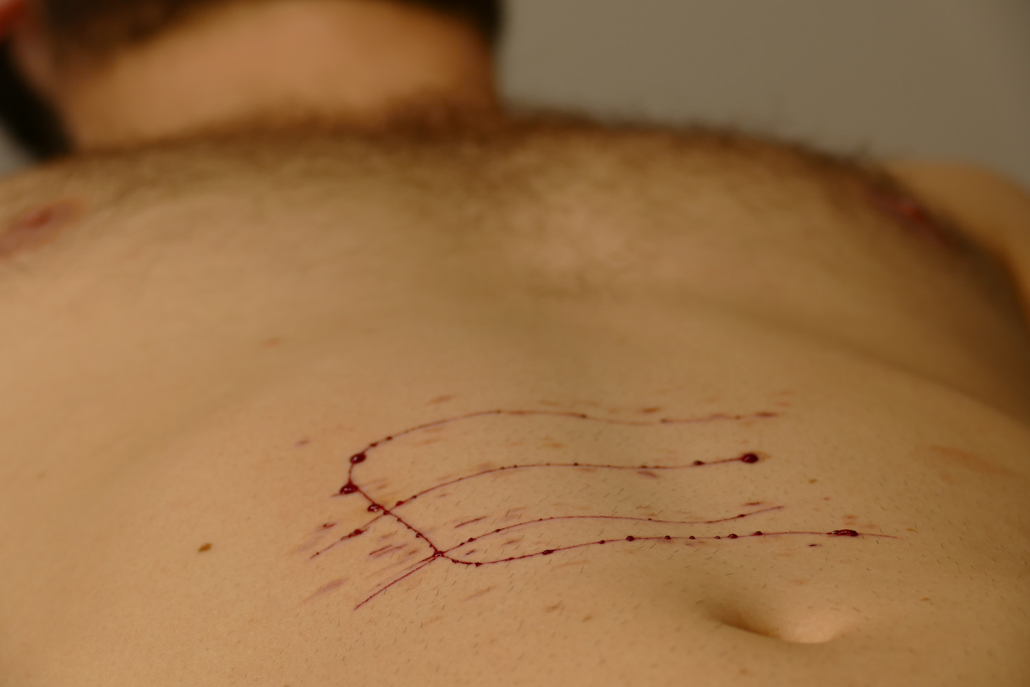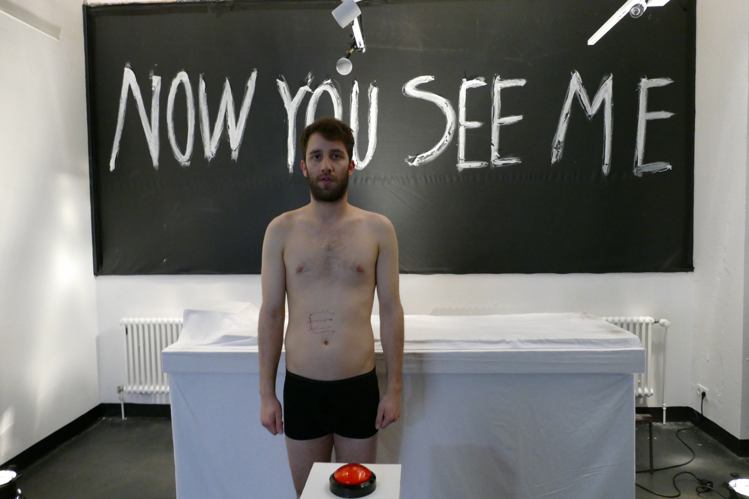 In einem dunklen Raum lag ich auf einen Tisch gebettet und unter einem Roboter fixiert. Der Roboter war mit einem Servomotor ausgestattet, der ein kleines Skalpell auf und ab bewegte. Geführt von Code wurde das Skalpell zu hundert Koordinaten auf meinem Bauch bewegt, die schließlich ein €-Zeichen bildeten. Jedes Mal, wenn das Publikum den Raum betrat, konnte es entscheiden, ob es die Aufführung sehen wollte. Wenn ja, konnten es einen rot leuchtenden Knopf drücken, der sich in der Mitte des Raumes befand.