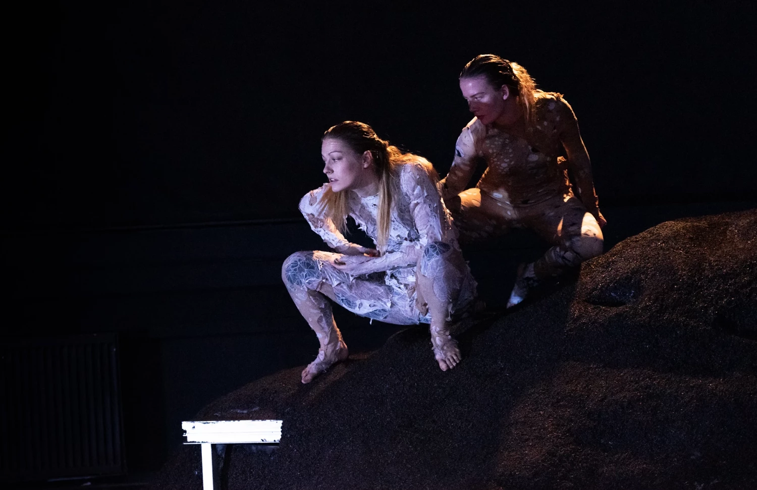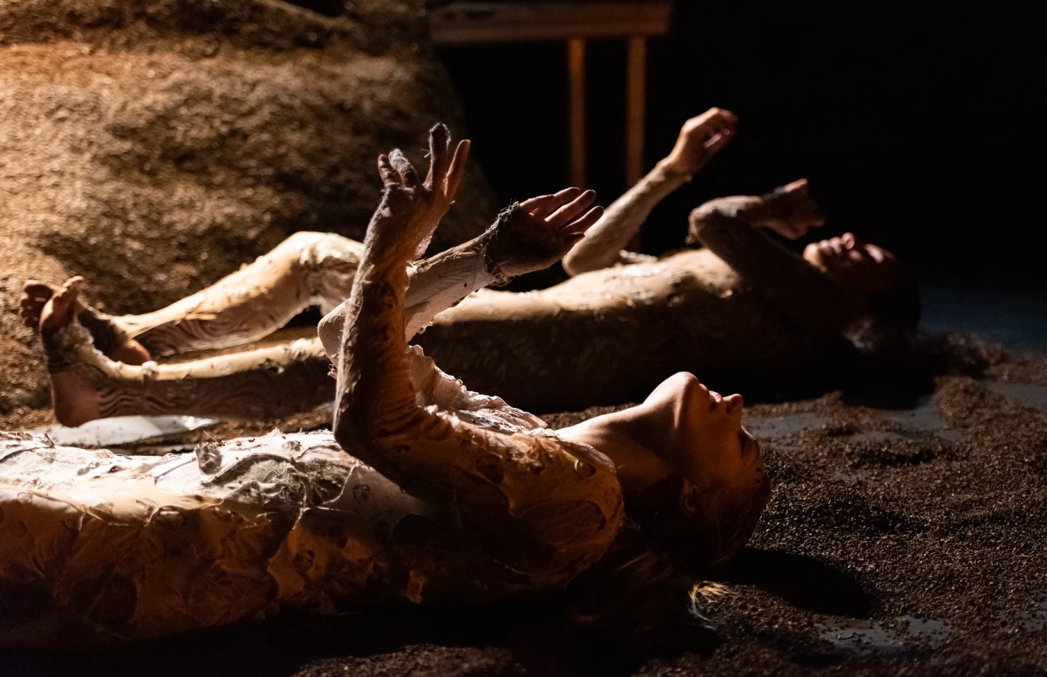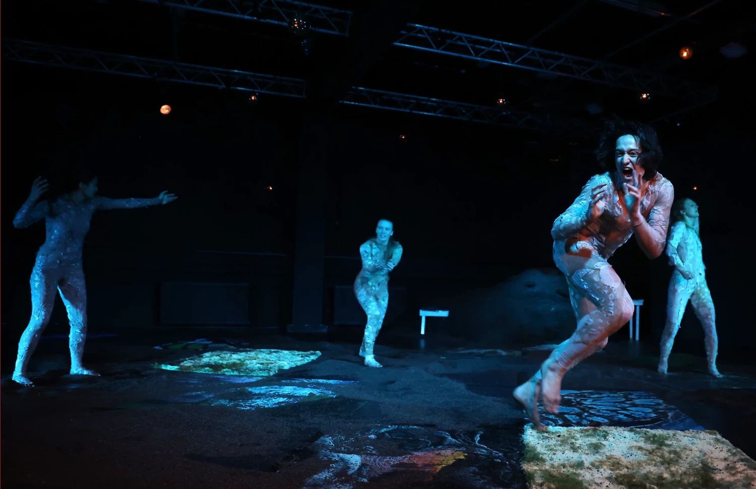 Das Zeitalter des Anthropozän ist Vergangenheit, die prophezeite ökologische Krise ist eingetreten. Einige Menschen haben die Katastrophe überlebt. Sie erinnern sich noch an alte Zeichen und Narrative, sind aber in einer Phase des Übergangs und der Verwandlung. Doch sie haben miteinander eine neue Fähigkeit entwickelt: sie können ein nervöses, hochsensibles, emphatisches System herstellen, in dem jede Empfindung, jede Schwingung mit allen anderen im Raum geteilt wird.