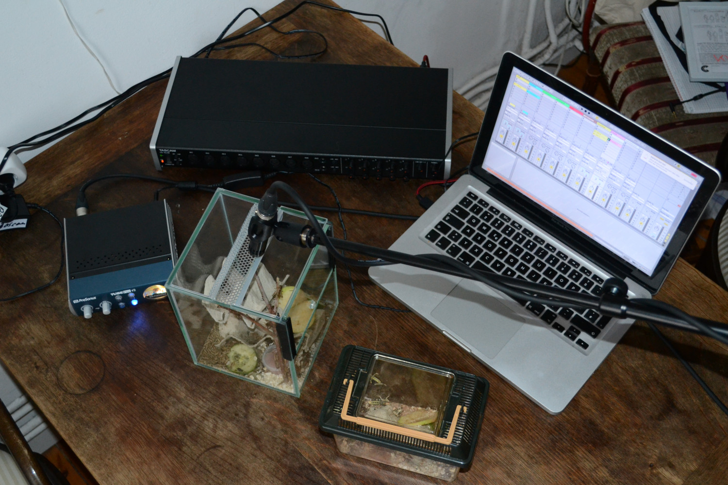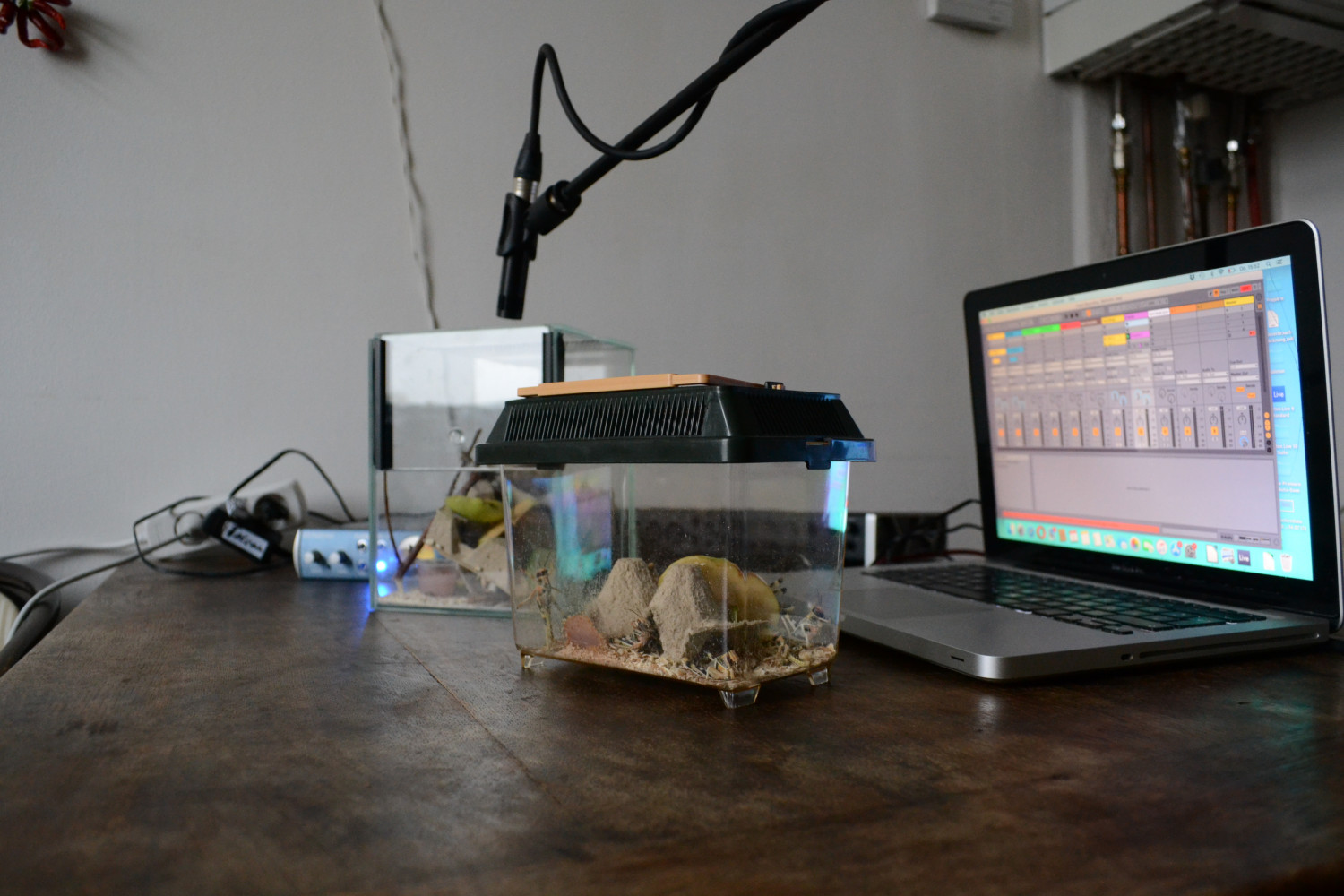 Für Nerven habe ich Field Recordings mit verschiedenen Insekten aufgenommen: Das Zirpen von Grillen, die Sprünge von Heuschrecken auf dünnem Metall u.a. Dazu kamen Aufnahmen der Stimmen und Bewegungen der Tänzer*innen, Recordings von Blechblasinstrumenten sowie analog eingespielte Elektronik. Die in einem zweimonatigen Probenprozess entstandene Soundwelt, wurde Teil einer immersiven 4.1. Bühneninstallation. Dabei erweiterten in der Tribüne verbaute Bassshaker die audiovisuelle Wahrnehmung auf die sensorische Ebene.