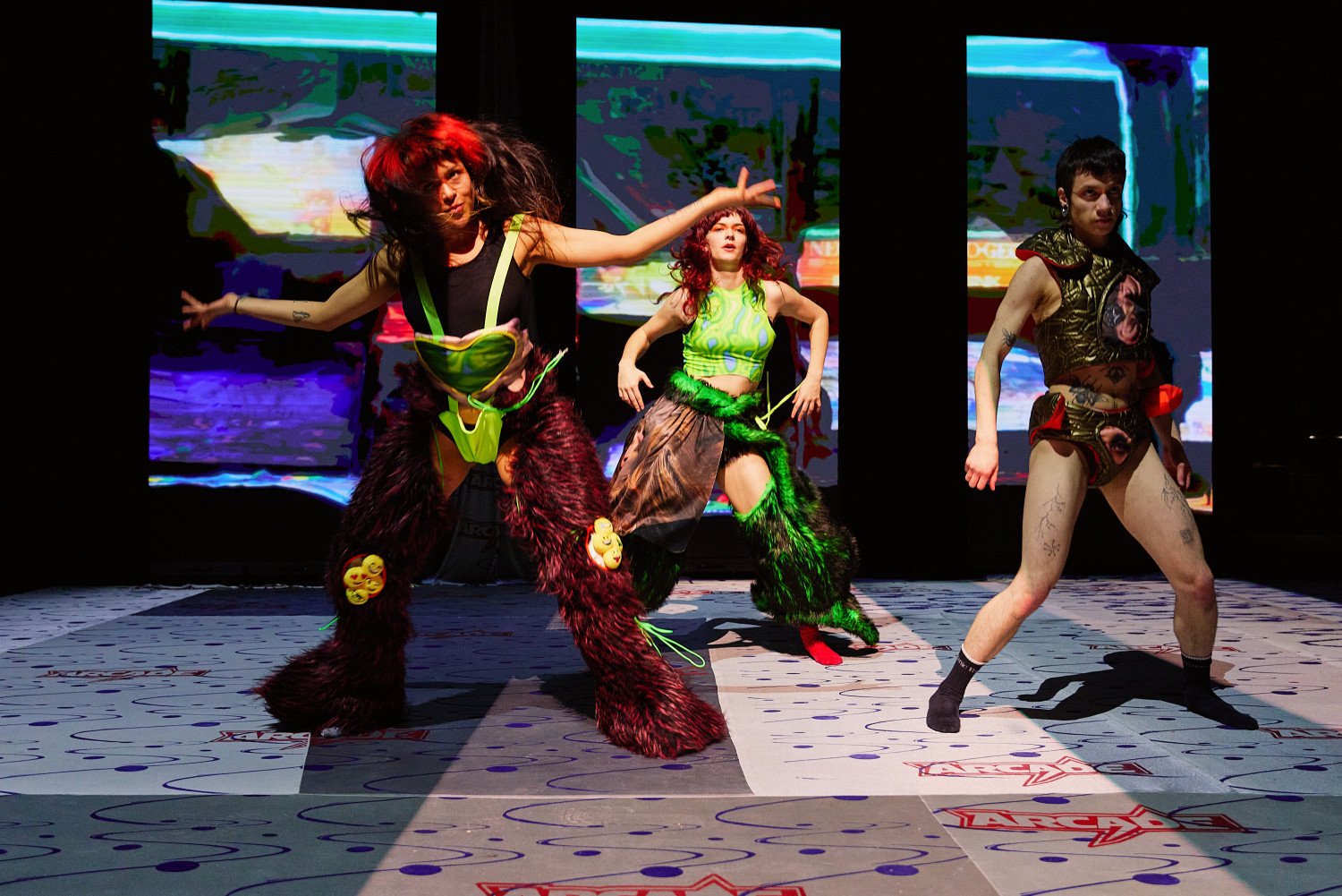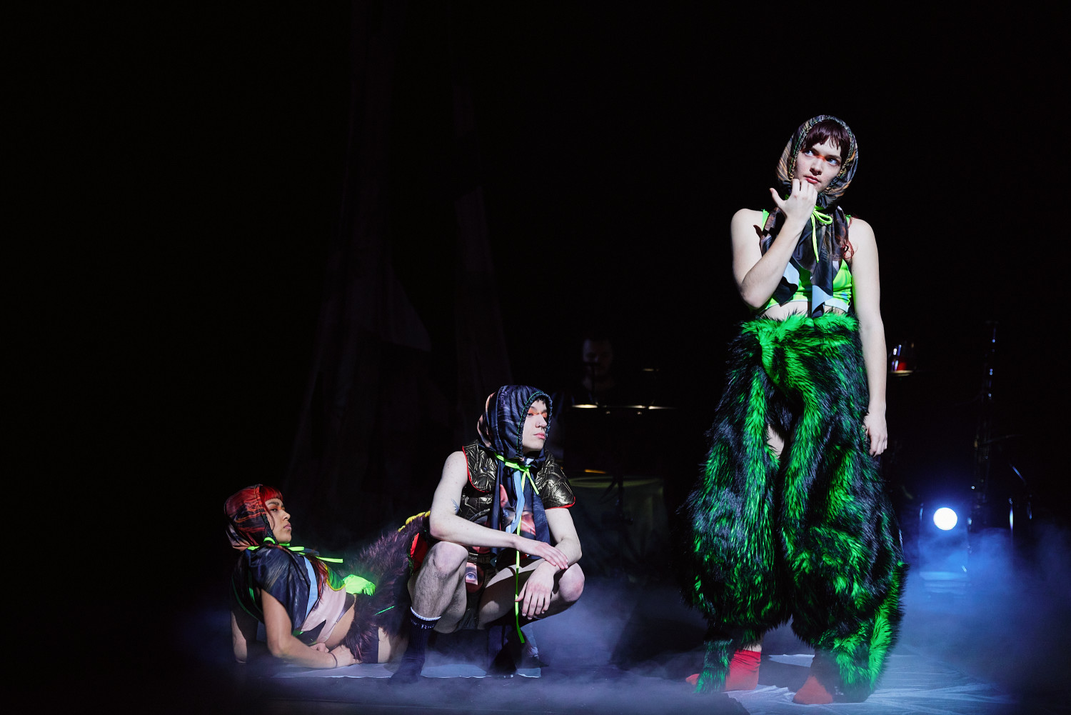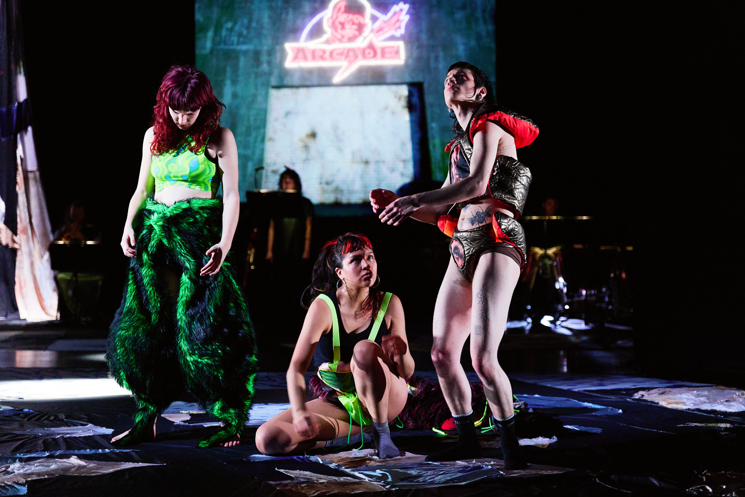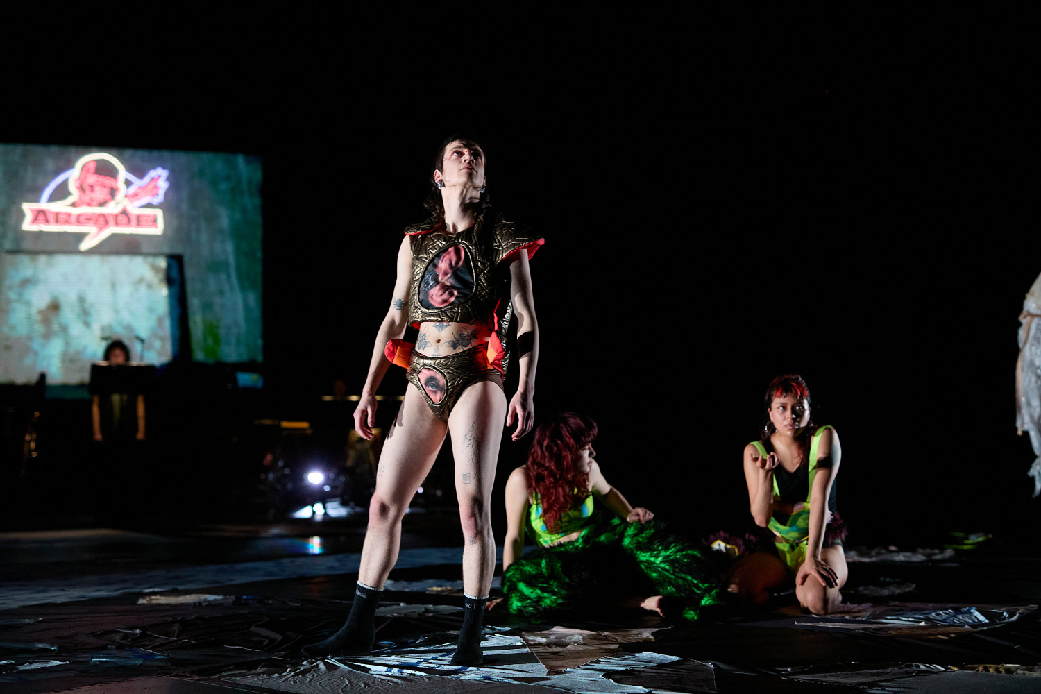 SLOP, oder „Junk“, bezeichnet minderwertige Texte und Bilder, die mit Hilfe generativer künstlicher Intelligenz produziert werden. Für Christopher Ramms Masterarbeit in Multimedia-Komposition an der HFMT Hamburg diente das Konzept von SLOP, das zunehmend die virtuelle Welt verschmutzt, als Metapher für unsere Gesellschaft im Spätkapitalismus. Während techno-utopische Zukunftsvisionen die rücksichtslose Ausbeutung des Planeten rechtfertigen, versinkt der Großteil der Erde in virtuellem und realem Müll. Vor diesem Hintergrund erzählt die Multimedia-Performance die Geschichte einer Tanzkompanie, die sich durch eine sehr nahe Zukunft kämpft. In diesem Kampf ums Überleben und Weitermachen entstehen selbstermächtigende, queere und fürsorgliche Narrative des Transhumanismus und der Zukunft.