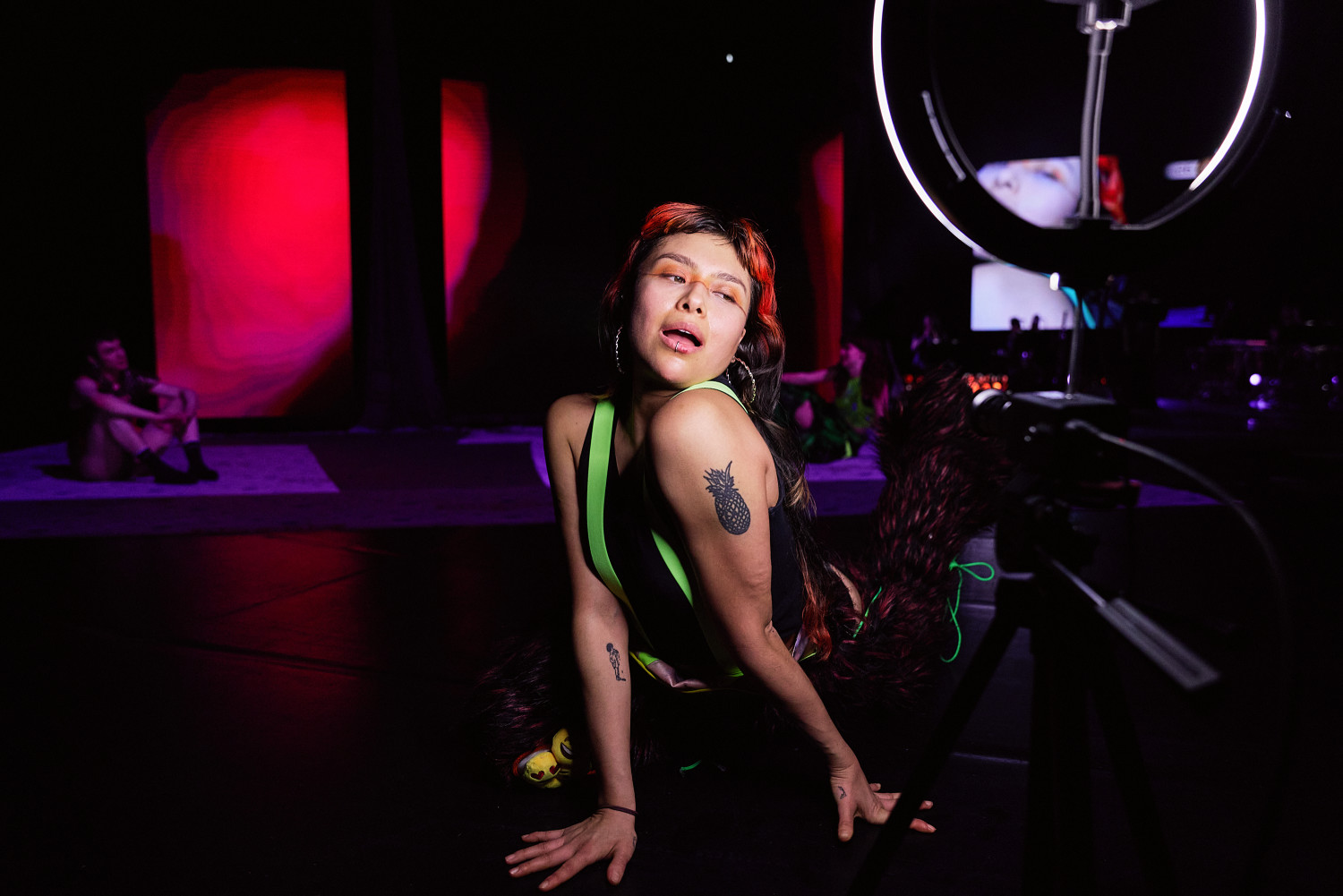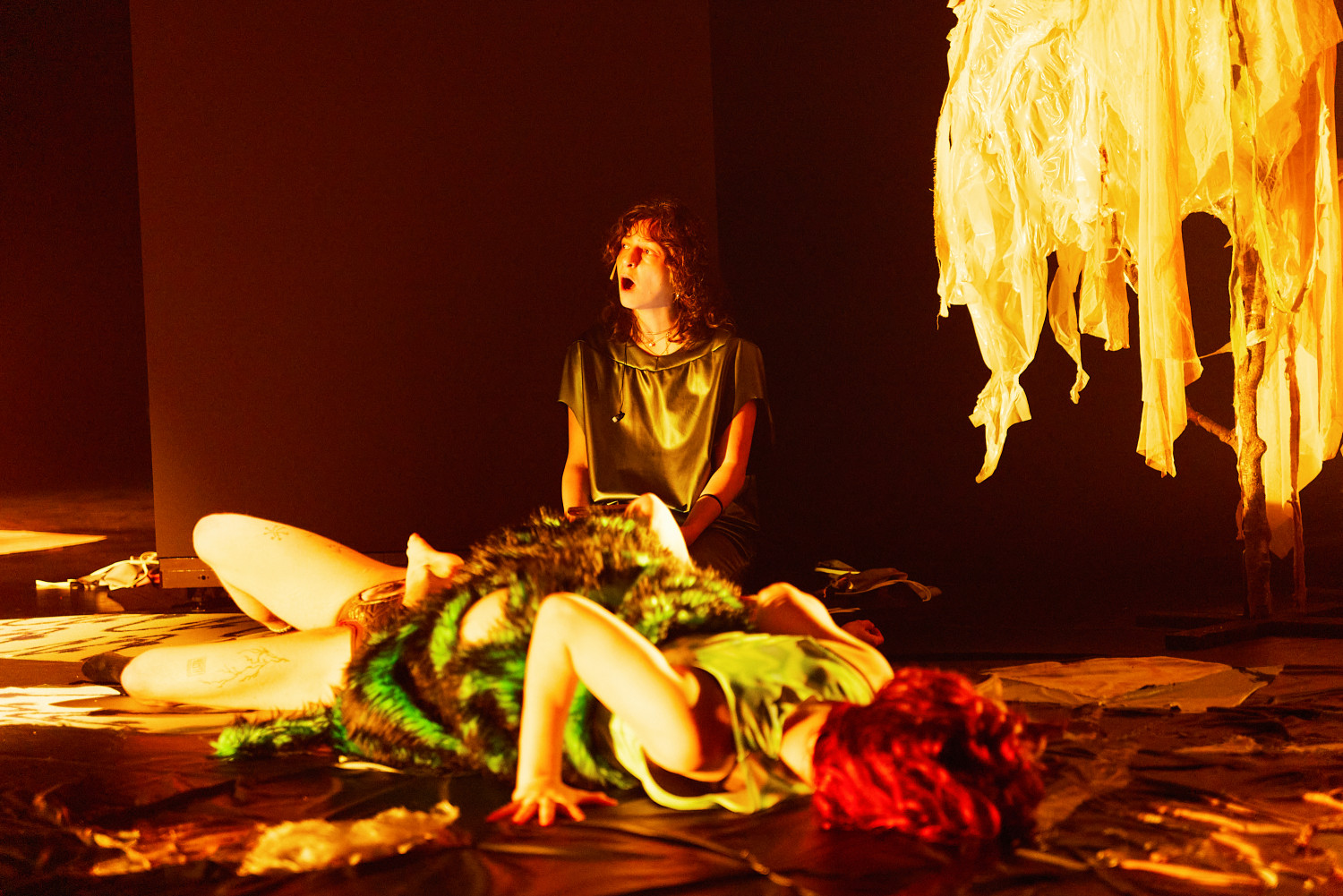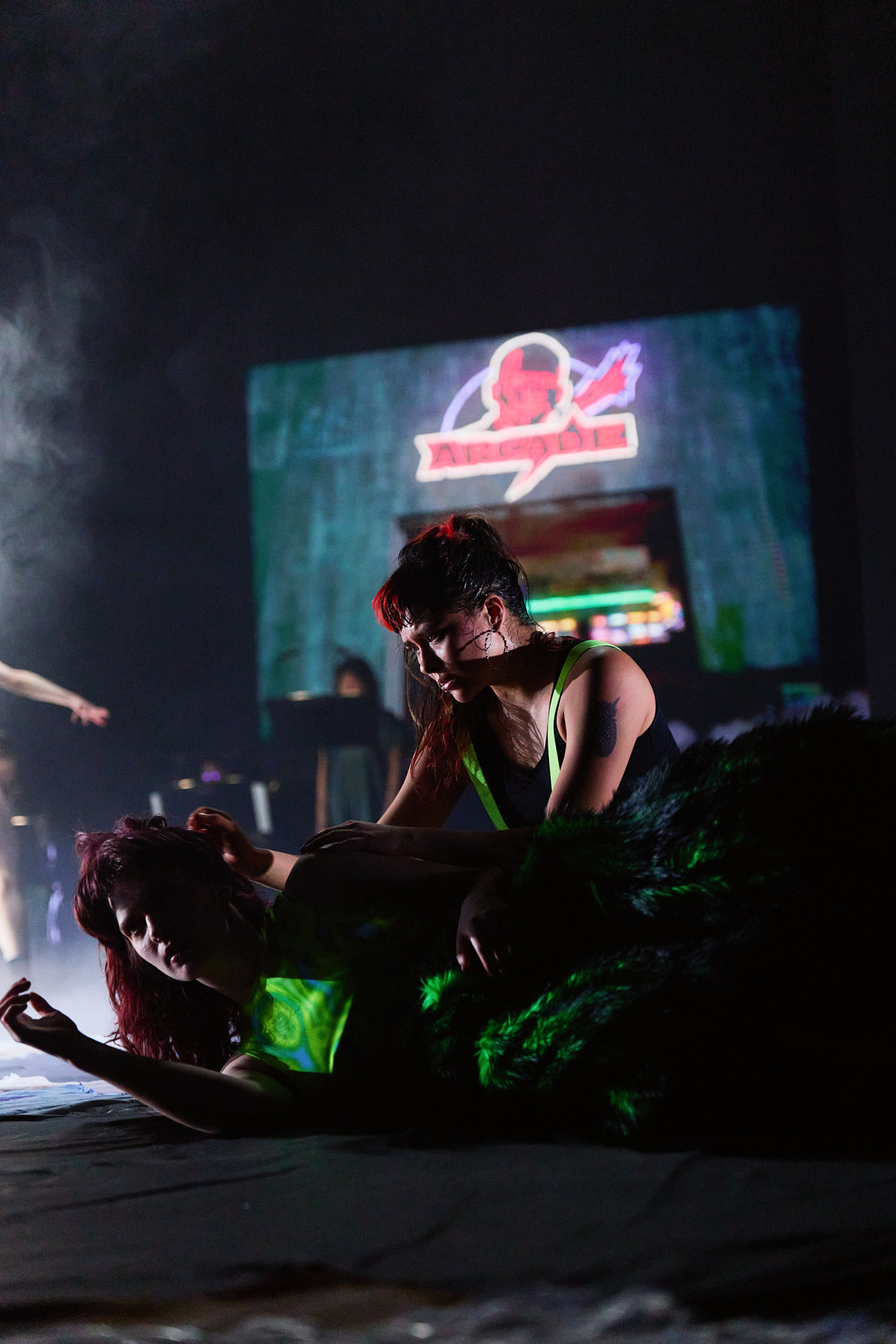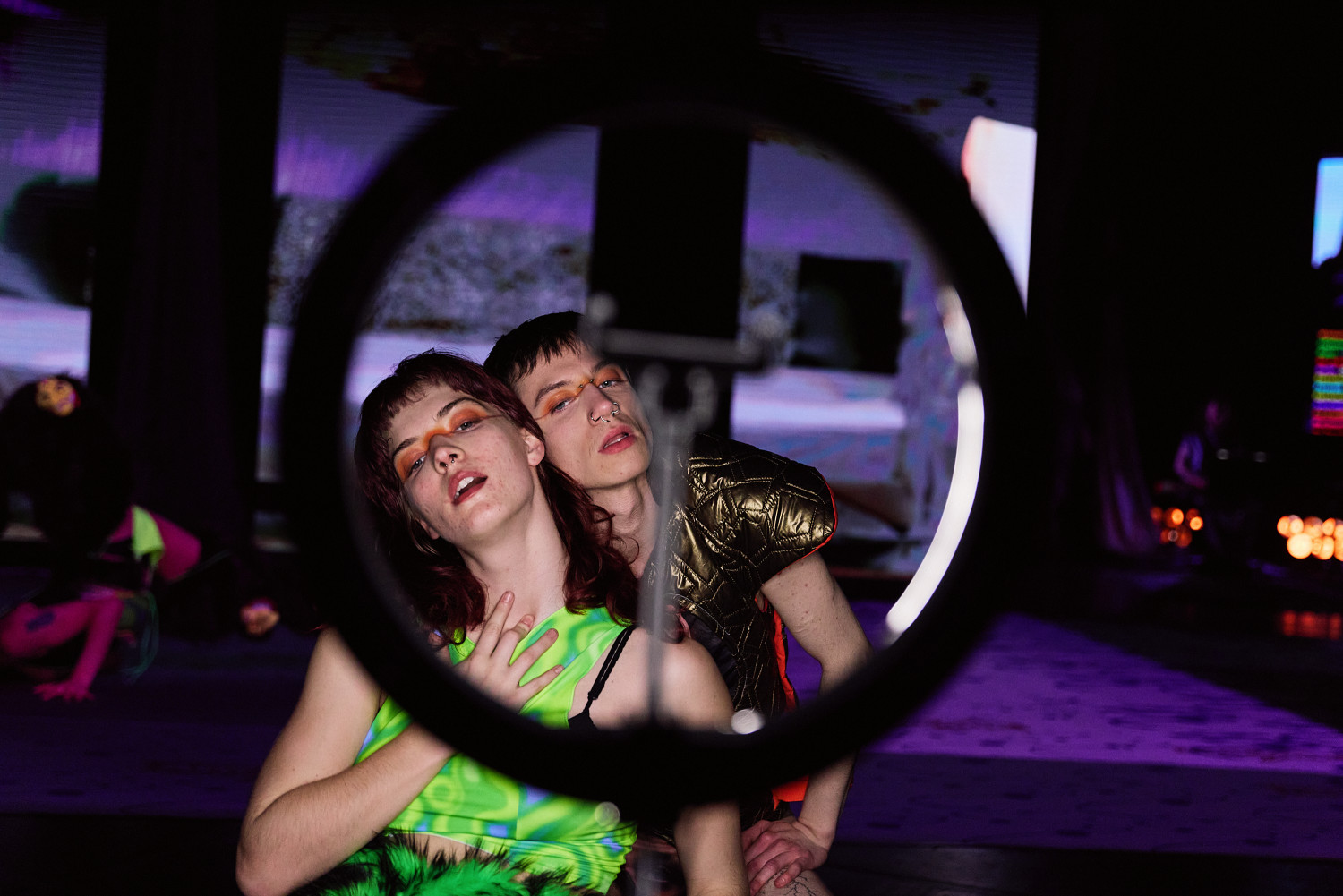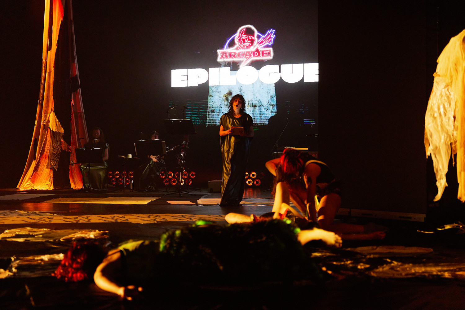 SLOP, oder „Junk“, bezeichnet minderwertige Texte und Bilder, die mit Hilfe generativer künstlicher Intelligenz produziert werden. Für Christopher Ramms Masterarbeit in Multimedia-Komposition an der HFMT Hamburg diente das Konzept von SLOP, das zunehmend die virtuelle Welt verschmutzt, als Metapher für unsere Gesellschaft im Spätkapitalismus. Während techno-utopische Zukunftsvisionen die rücksichtslose Ausbeutung des Planeten rechtfertigen, versinkt der Großteil der Erde in virtuellem und realem Müll. Vor diesem Hintergrund erzählt die Multimedia-Performance die Geschichte einer Tanzkompanie, die sich durch eine sehr nahe Zukunft kämpft. In diesem Kampf ums Überleben und Weitermachen entstehen selbstermächtigende, queere und fürsorgliche Narrative des Transhumanismus und der Zukunft.