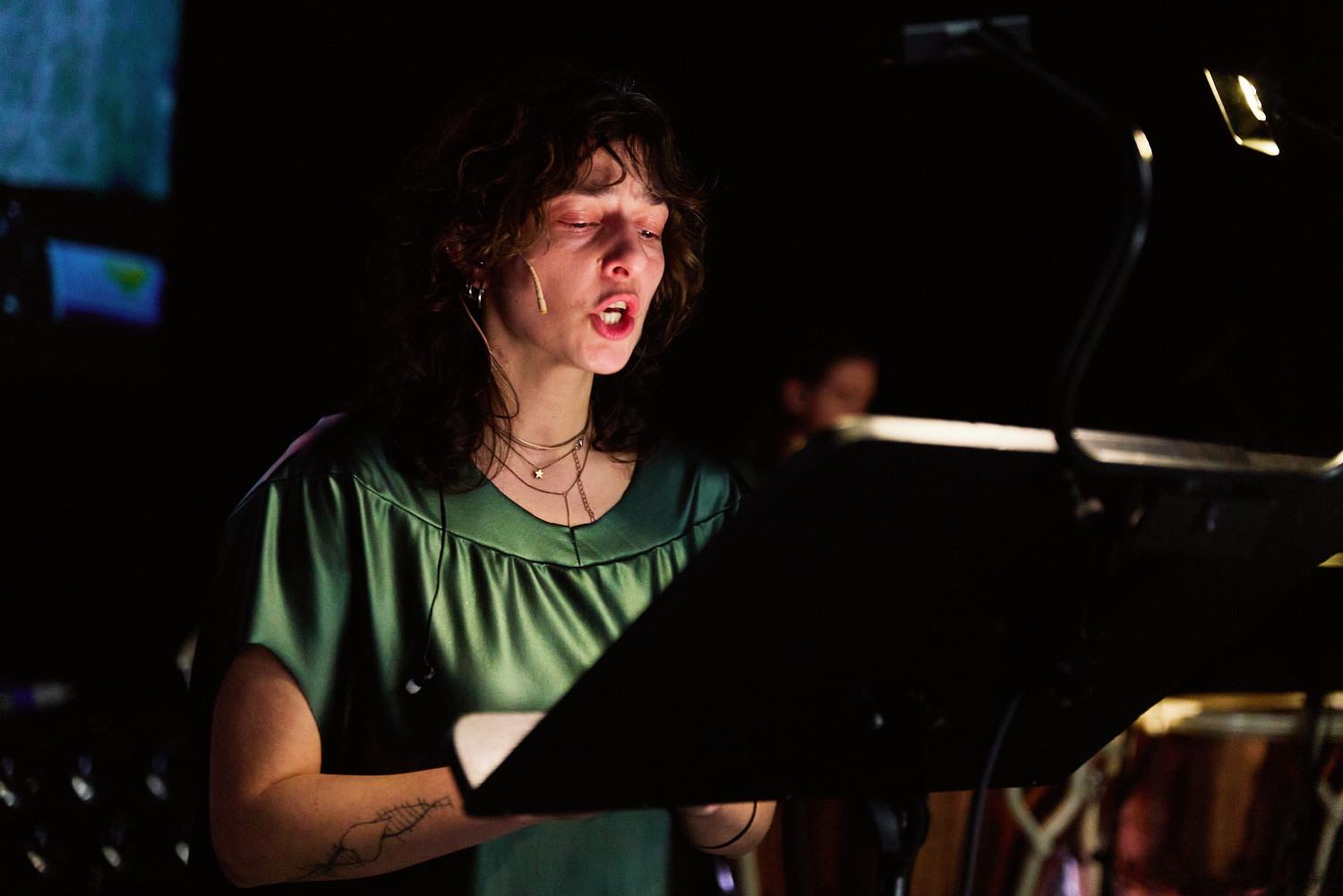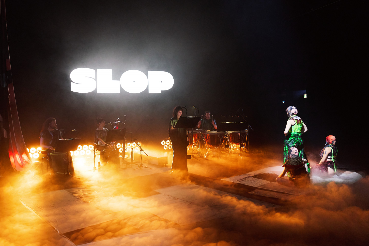 SLOP wurde komponiert für Sopran, Kontrafagott & Fagott, Trompete, Pauken, Tonband, Live-Elektronik, drei Tänzer, Videowände und Licht. Das Konzept sowie die Komposition wurden von Christopher Ramm entwickelt und in enger Zusammenarbeit mit den jeweiligen Teams umgesetzt. Nichts auf der Bühne stammt aus einem einzigen Kopf oder Körper, sondern wurde durch gemeinsame Anstrengungen möglich. Ich möchte Alexander Schubert und der Multimedia-Abteilung für ihre großartige Arbeit danken, die Multimedia Composition zu einem herausragenden Programm macht. Ich möchte dem gesamten FORUM-Team für seine Unterstützung danken. Zu guter Letzt möchte ich meinem Partner Marco Merenda, all meinen Freunden und allen meinen Kommilitonen für ihre enorme Unterstützung danken. Ich liebe euch.